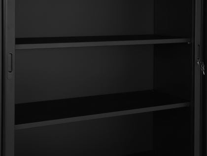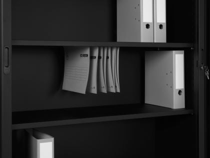 Deze roldeurkast wordt standaard geleverd met 2 legborden in dezelfde kleur als de kast, die eenvoudig op de gewenste hoogte kunnen worden geplaatst. Dankzij een verstelbare indeling per 3,5 cm kunt u de kast helemaal aanpassen aan uw behoeften. Bovendien biedt het bodemlegbord een volledig vlakke bodem, waardoor u 3 ruime opbergvakken kunt creëren.